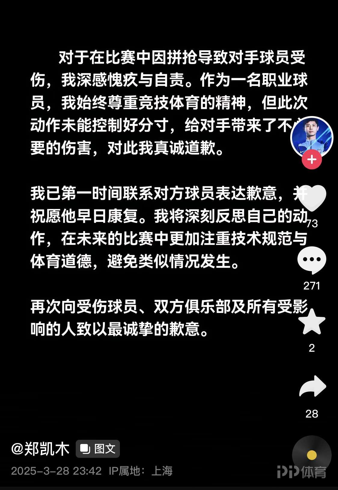 赛后社媒上一个名为“郑凯木”的账号致歉,但IP所在地是上海,真实性存疑。